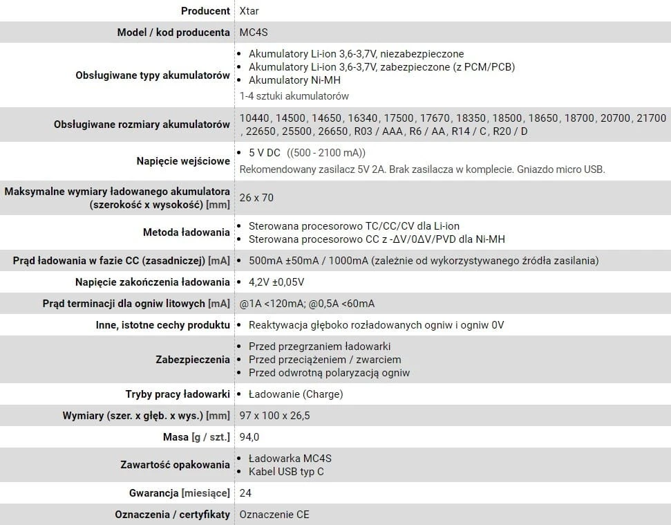 XTAR ŁADOWARKA DO AKUMULATORÓW CYLINDRYCZNYCH LI-ION MC4S