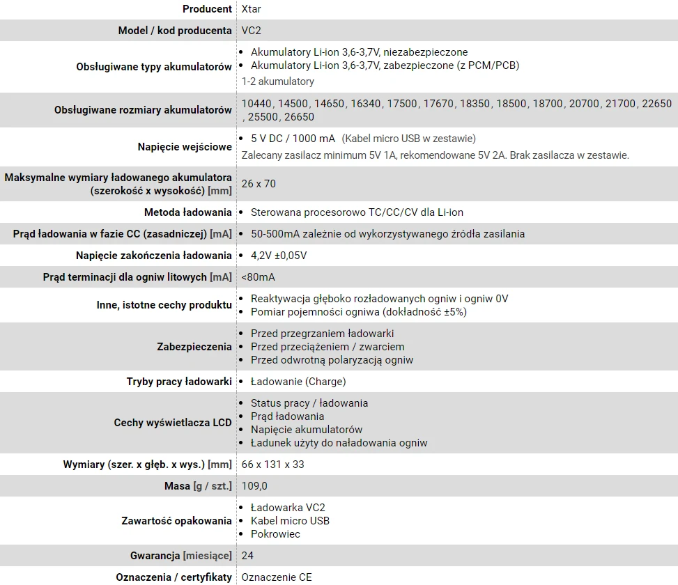 XTAR ŁADOWARKA DO AKUMULATORÓW CYLINDRYCZNYCH LI-ION VC2